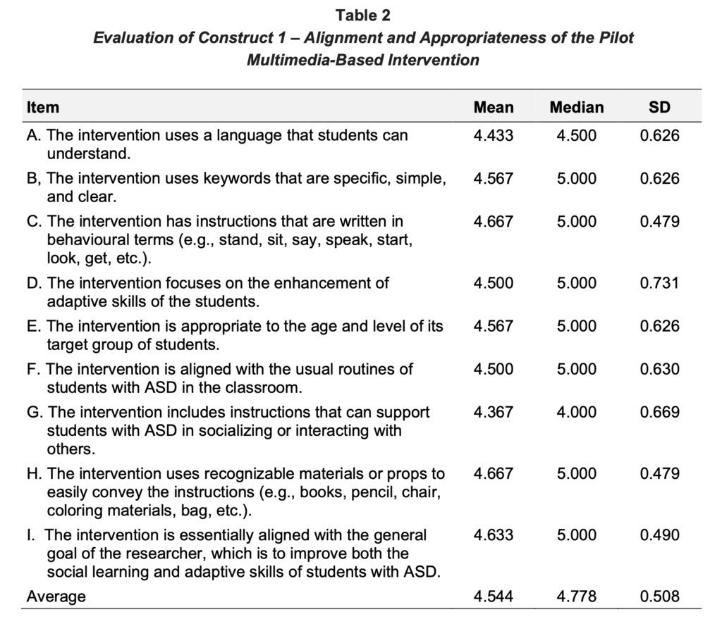 An evaluation was conducted to examine the potential effectiveness of a multimedia-based intervention, with the participation of 30 Filipino public special education teachers as teacher-respondents. The intervention was designed to enhance the social learning and adaptive behaviors of students with autism spectrum disorder (ASD), particularly those in Level 1 or students who require support. The teacher-respondents utilized an evaluation grid that underwent rigorous tests of validity and reliability. The evaluation grid comprises the following constructs: alignment and appropriateness, utility and relevance, visual appeal, and overall engagement. Each construct has specific items or indicators in order to carefully examine the potentiality of the multimedia-based intervention. The results revealed that the intervention was perceived to be highly effective in improving the social learning and adaptive behaviors of students with ASD. The evaluation of the teacher-respondents has also shown similarities, whether they are grouped according to their number of years in the field or the number of students with ASD enrolled in their classes. Finally, to further enrich the effectiveness of the multimedia-based intervention, an action plan was outlined based on the feedback of the teacher-respondents for each of the four constructs. The researchers of this study aimed to gauge the possible effectiveness of an intervention tool that uses technology to support learners with and without special needs. This piloted multimedia-based intervention is hoped to be used in large-scale research that utilizes robots to assist special education teachers, especially in teaching basic social behaviors and daily routines to their students with ASD.