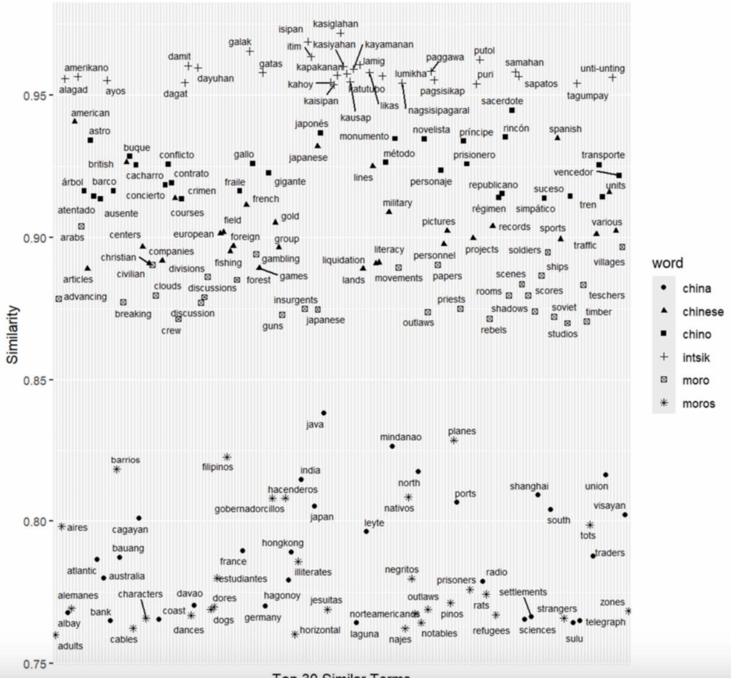 Additionally, the article looks at variances between articles in different languages, which show both imbalances in the frequency of the terms Moros and Chinese, differing word associations, as well as a close relationship with the respective colonial periods in which languages such as Spanish and English proliferated.