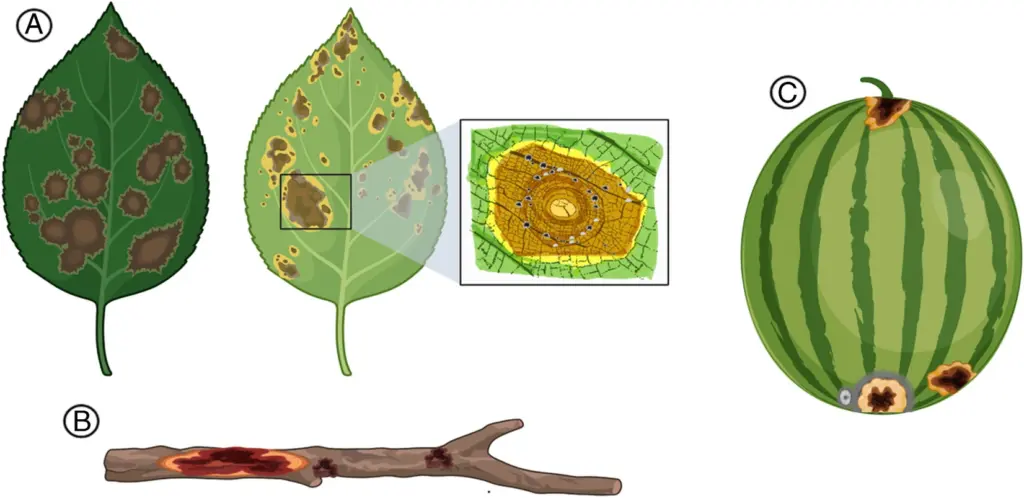 Paramyrothecium is a fungus that can cause plant diseases like coffee leaf spots, muskmelon crown rot, and eggplant crater rot. It lives in soil, decaying plant material, and on diseased fruits, stems, and leaves of various plants. The fungus spreads through wind, rain, contaminated soil, and plant debris. This fungus can infect plants when conditions are ideal, like if the soil is constantly wet and the plant is already injured (damaged tissues). This creates an open invitation for the fungus to get in and make the plant even sicker. To minimize crop losses, farmers can practice good water management, soil sanitation, and proper crop handling. They can also use biological control agents and pesticides to control the fungus and the associated diseases.
