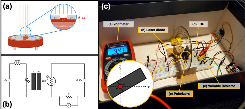 In a voltage-divider network between the LDR and a variable resistor, the voltage drop across the second resistor can be measured to characterize the resistance response of the LDR to light. Here, students will integrate Malus’ Law both into Ohm’s Law and the power law model of the LDR to estimate the resistance of the LDR to varying intensities of light. To manipulate the intensity of incoming light towards the LDR, the students will insert a cross polarizer between the LDR and the laser diode. This method is then compared to direct resistance measurement. Since it requires minimal supervision from teachers, this can also be performed by high school and undergraduate students as a do-it-yourself experiment to discuss circuits and optics.