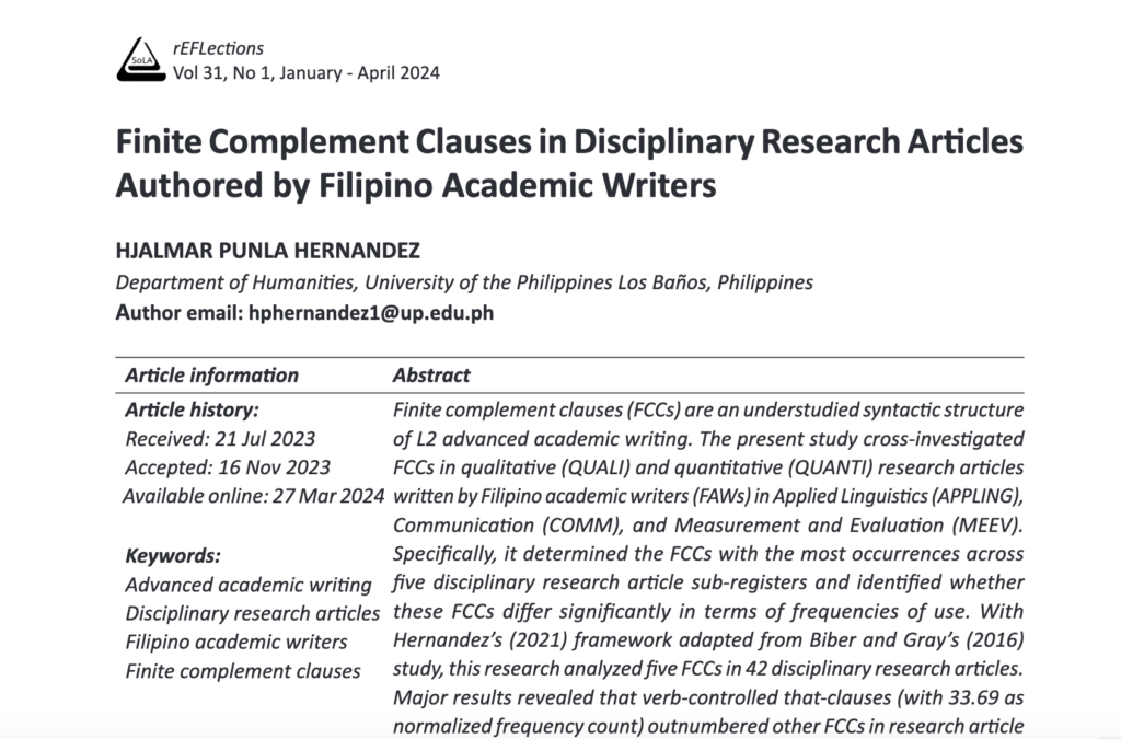 Exploring finite complements clauses in disciplinary research articles is a pressing need. It may advance positive implications for academic writing instruction. Equally important, such a linguistic investigation is crucial because it can contribute towards fulfilling the Philippine education’s thrust of creating more research publications—as stipulated in the Philippines’ Commission on Higher Education Memorandum Order Number 15, Series of 2019 (CMO No. 15, s. 2019) and Department of Education Order Number 39, Series of 2016 (DepEd Order No. 39, s. 2016).