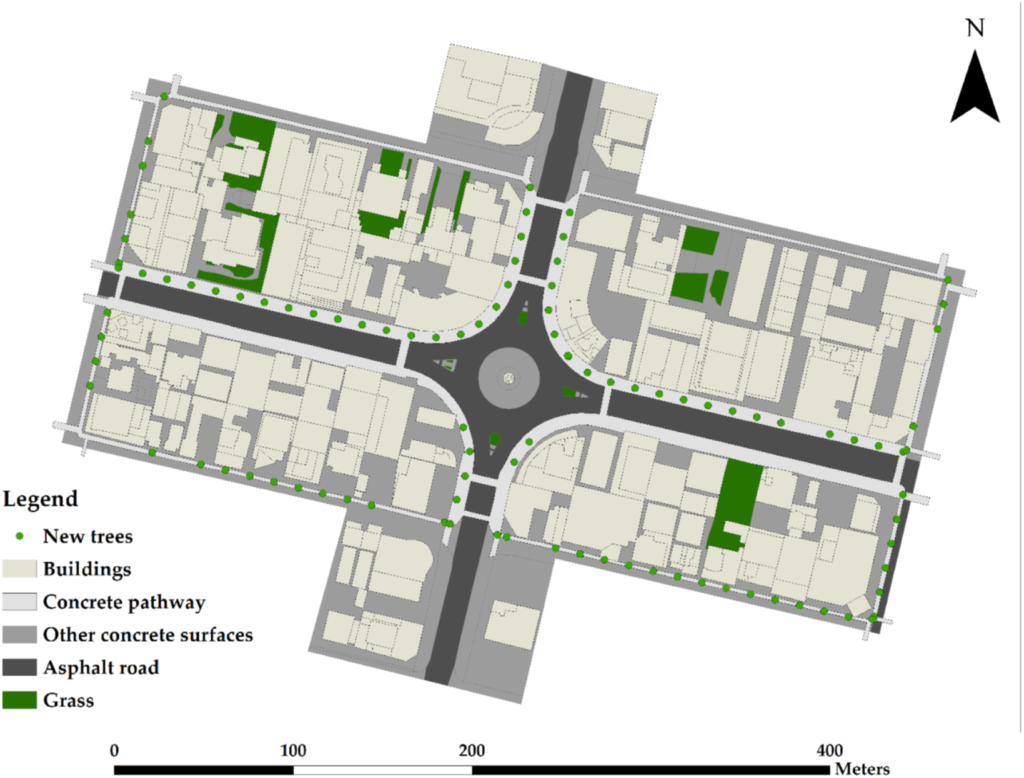 Trees can improve the walkability of urban outdoor spaces. Hence, studies have been conducted to examine and elucidate the relationship between tree distribution and walking frequency. This study addresses the lack of tool that can exploit these relationships and optimize tree distribution to maximize walking. A modeling and simulation framework to optimize the distribution of urban trees to maximize walking has been developed. The framework features a model that simulates “temperature” considering the locations of trees. Environmental conditions are sensed by “humans” who experience various levels of comfort; these affects their decisions to walk or not. Tree distribution is iterated in order to find the tree distribution that generates maximum walking frequency. Based on the simulations, spacing between trees, direction of neighboring buildings, and shadowing of buildings affect walking frequency. Applying the framework in an urban area in the Philippines reveals that the optimal planting strategy is to plant trees at a 14 m spacing on all sidewalks except those which have buildings to the south and only on locations with minimal building shadows. The proposed framework can be a powerful tool for urban tree planting projects.